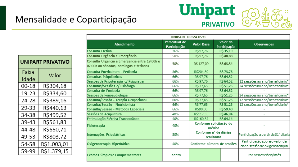 TABELAS DE VALORES DE MENSALIDADE E COPARTICIPAÇÃO